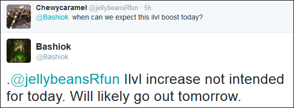 Bashiok let us know that the item level boost is expected to go out Wednesday. Keep in mind that isn't a guarantee.